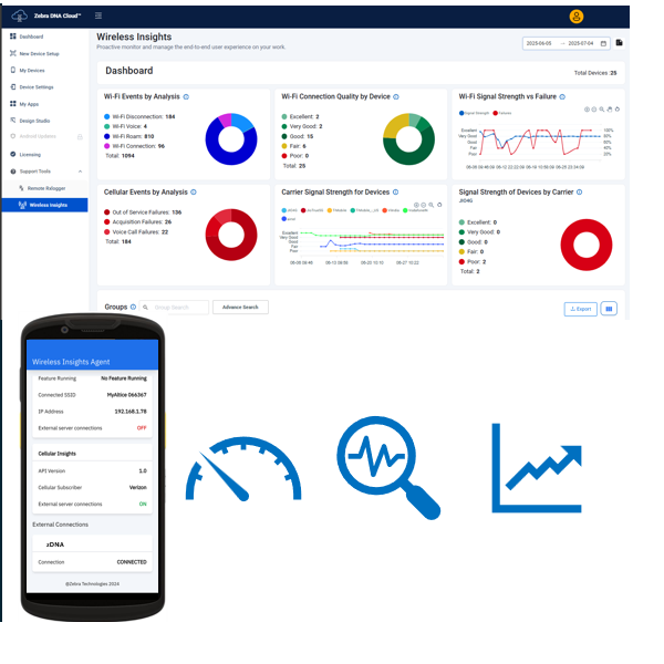 Wireless Insights and Analyzer firmy Zebra poprawia wydajność sieci komórkowej, analizując jej wydajność i identyfikując błędy w celu łatwego rozwiązywania i diagnozowania problemów.